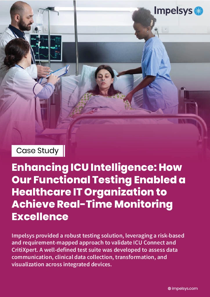 Impelsys’ rigorous functional testing ensured the seamless integration of ICU Connect and CritiXpert with connected medical devices, enabling accurate real-time data collection, processing, and visualization. The validated system improved clinical decision-making by enhancing data reliability, remote monitoring capabilities, and ICU tracking efficiency. As a result, the client achieved a robust, high-performing real-time monitoring platform that optimized patient care and operational workflows.