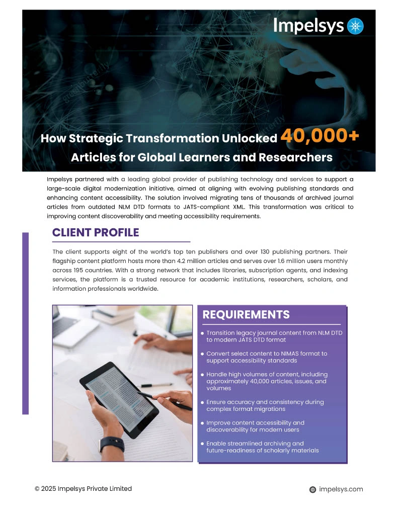 Impelsys’ automation-led solution ensured standards-compliant conversion of legacy content to JATS and NIMAS formats. Enhanced metadata and structured content improved discoverability across academic databases, while the use of custom XSLTs and automated workflows significantly reduced processing time and errors. For users like Dr. Oliver Hughes*, a cardiologist and journal reviewer in Manchester, England, this meant quicker access to clinical research that informs real-time patient care. And for Emily Carter*, a visually impaired 10th-grade student in Edinburgh, Scotland, the newly accessible articles empowered her to independently explore science content with her screen reader, turning challenges into curiosity and confidence. This transformation wasn’t just about data and standards, it was about making knowledge usable, searchable, and inclusive.