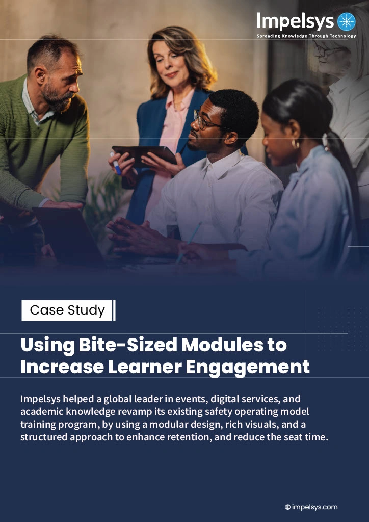 Impelsys had a detailed discussion with the key stakeholders to understand the client’s needs and challenges. The existing content was broken down into nine modules and a sequential learning pattern was introduced. By adopting a bite-sized learning approach and using engaging visuals, the seat time of the program was reduced and thus increasing the learner engagement.